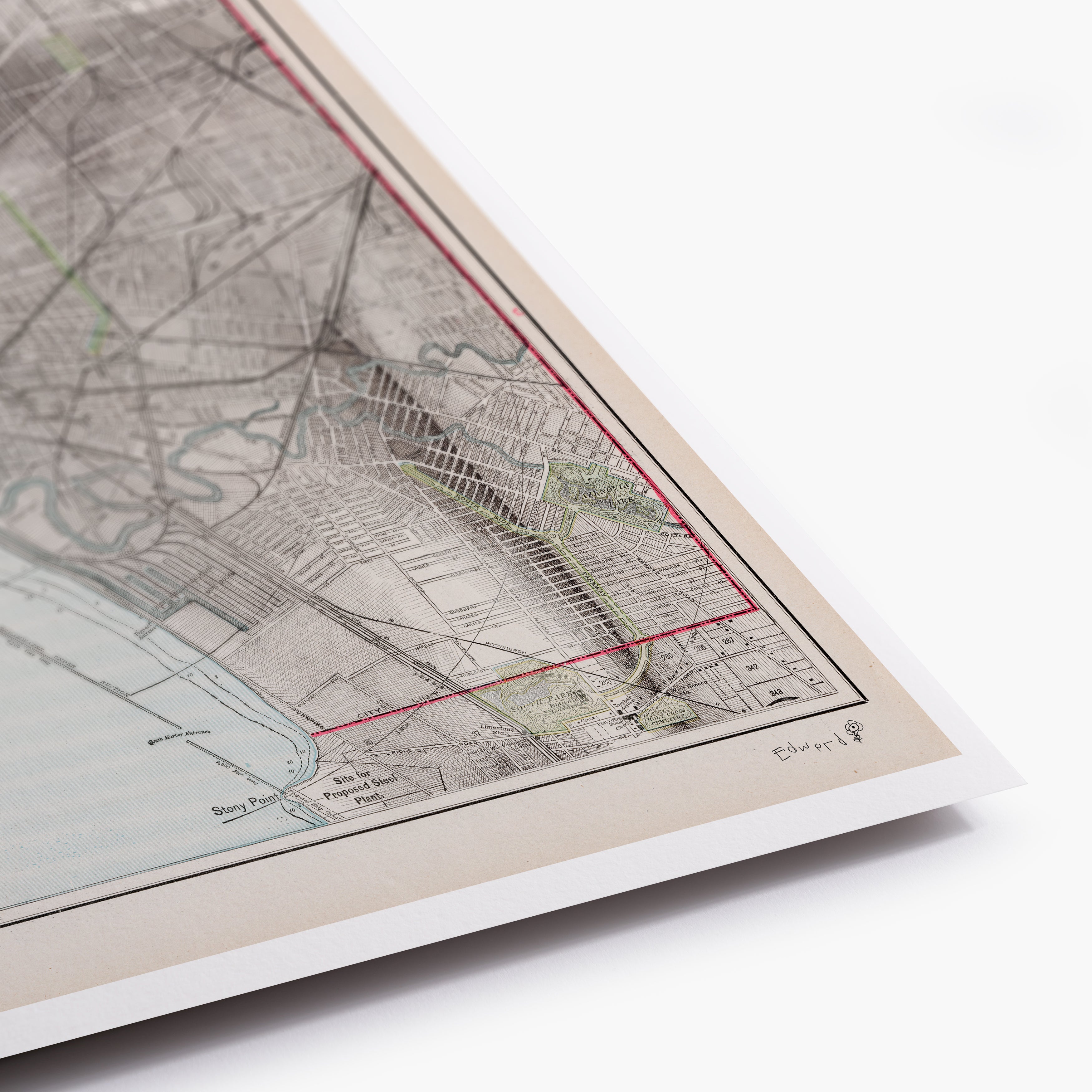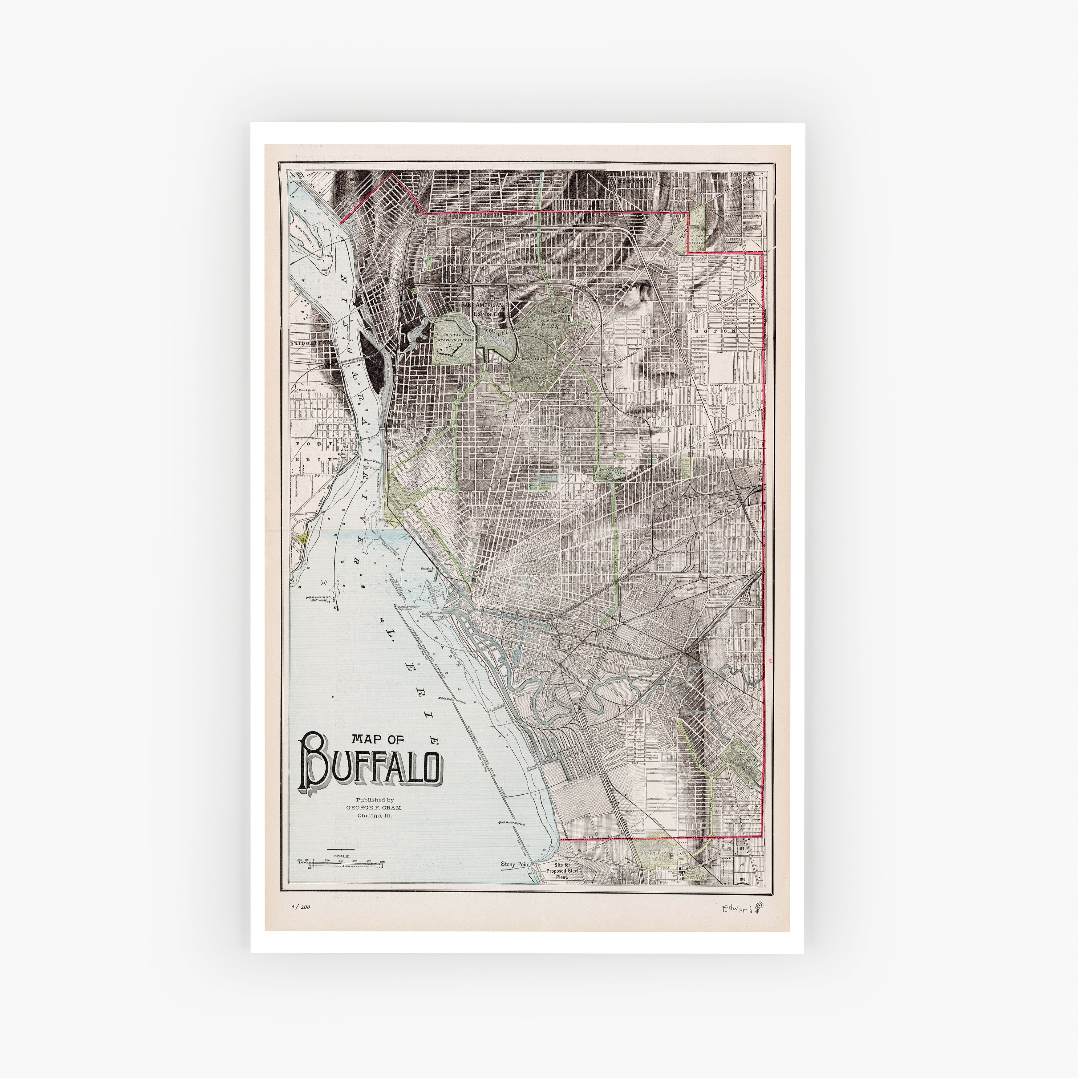 Ink drawing over an antique Cram atlas map of Buffalo, New York. The original map is dated around 1903 and shows landmarks including the Pan American Exposition; the World’s Fair.