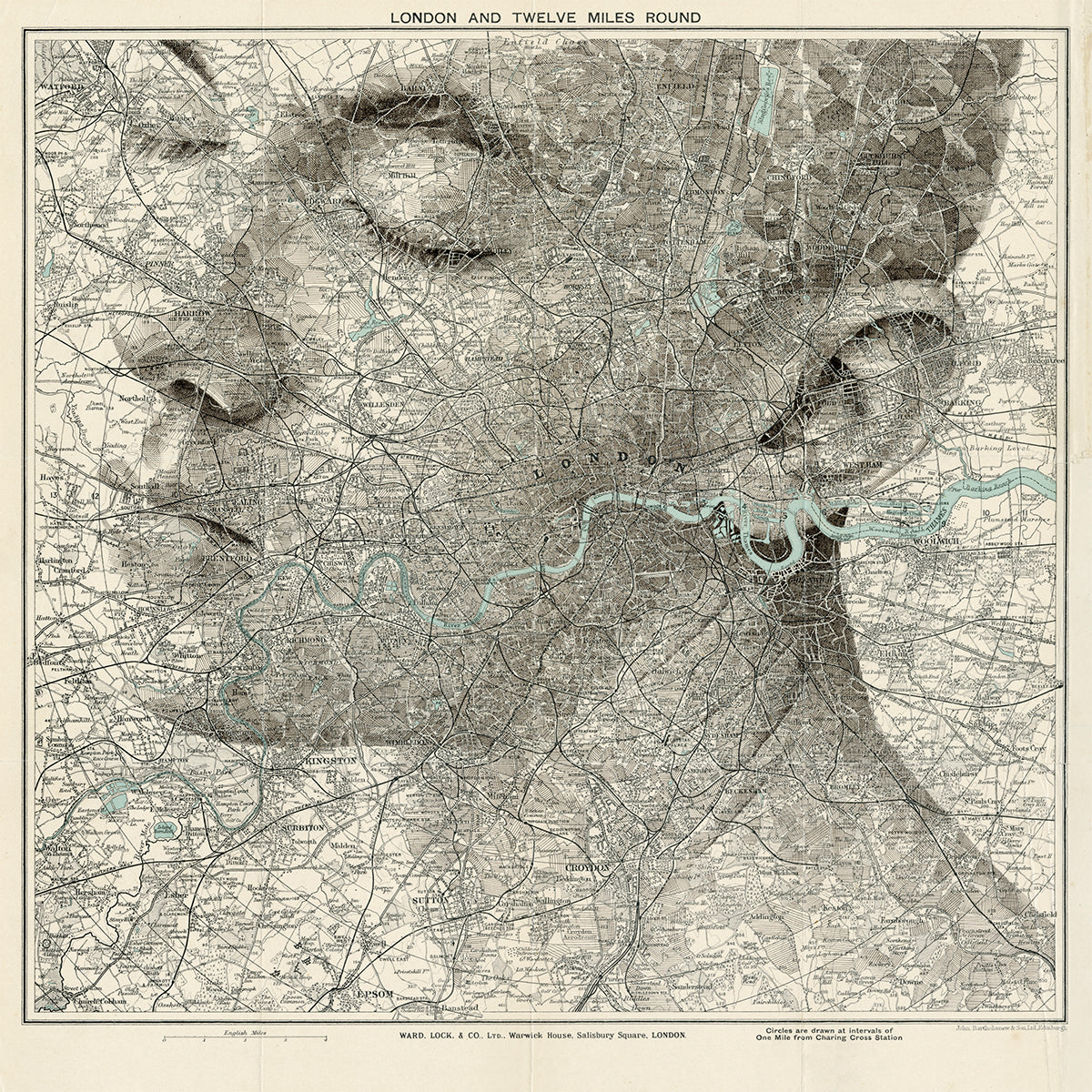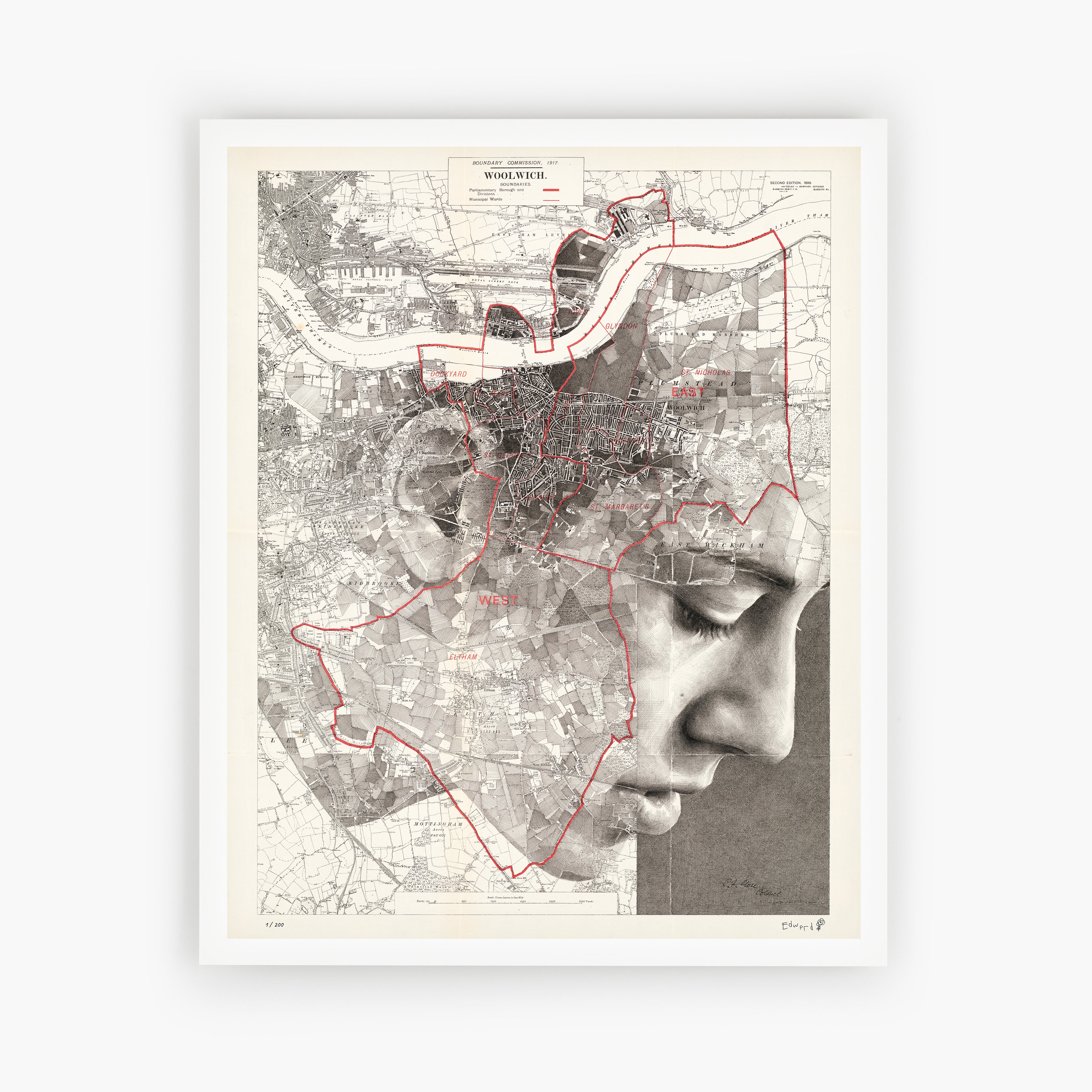 Ink drawing crosshatched over a 1917 Boundary Commission map of Woolwich, London, UK. The original underlying map shows parliamentary boroughs and wards outlined in red.
